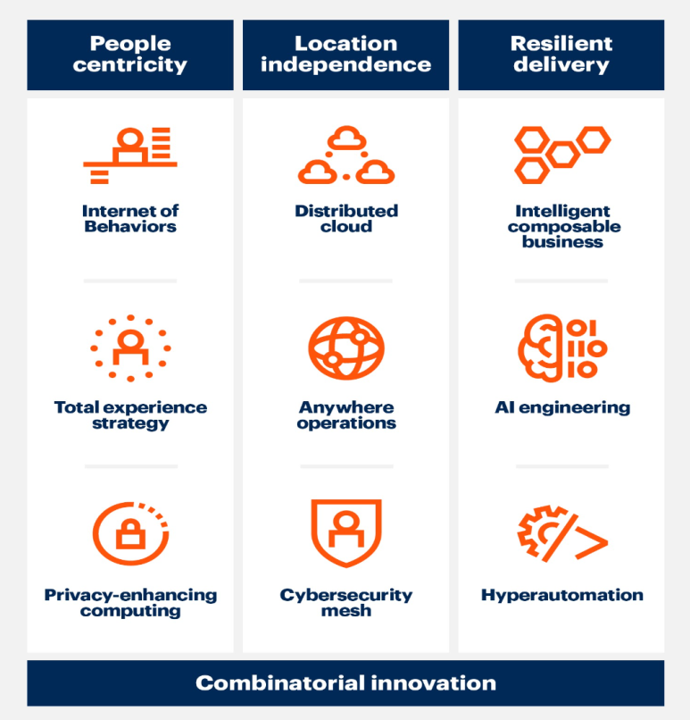 위치 독립성 (Location independence) : COVID-19는 직원, 고객, 공급 업체 및 조직 생태계가 물리적으로 존재하는 곳으로 이동했음. 위치 독립은 이 새로운 버전 의 사업을 지원하기 위한 기술 전환을 필요로 함