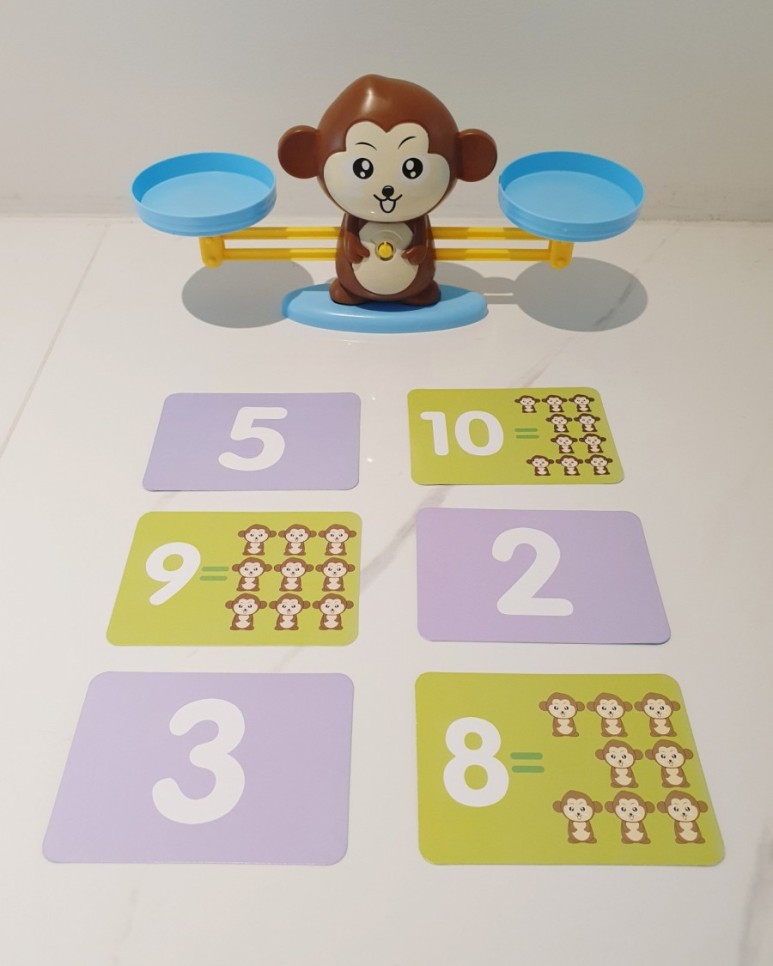 저울, 숫자 10개, 원숭이 모형 19마리,